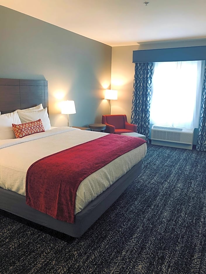 Stay in our comfortable and spacious King Room with Mobility Accessible Tub, perfect for 2 adults and 1 child. Enjoy the convenience of a King size bed, along with amenities such as a microwave and refrigerator to make your stay even more enjoyable.